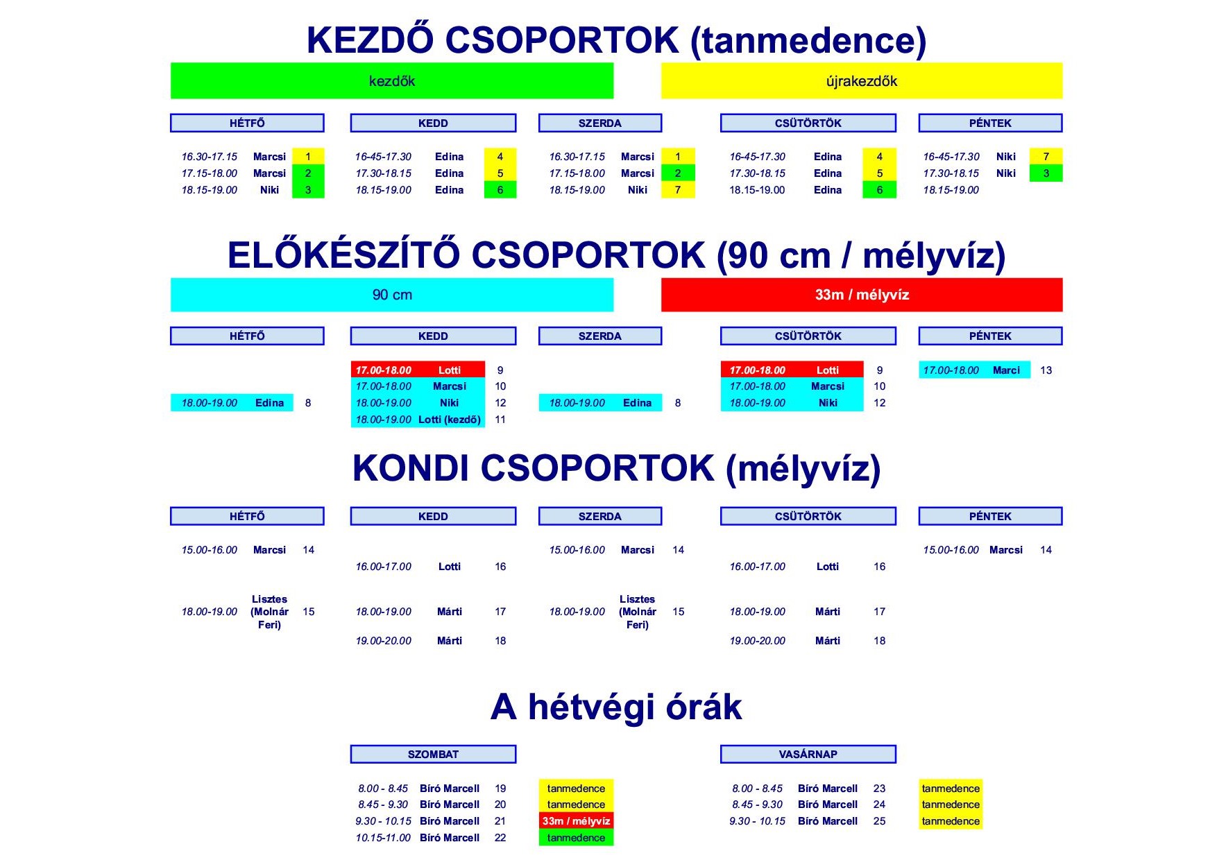 Mostani, frissített oldalunkon alapvetően a 2026 márciusában induló kezdő csoportjainkba tudnak jelentkezni / regsiztrálni. Ezeket az órákat zöld színnel jelöltük. A sárga színű órák a már futó csoportkainkat mutatják, ahová csak esetlegesen tudunk új résztvevőket csattlakoztatni – elsősorban annak függvényében, hogy milyen meglévő tudásszinttel rendelkeznek a jelentkezők. Kétség esetén kérem, hogy a kiválasztott kollégával direktben vegyék fel a kapcsolatot – a honlapunkon megtalálható kontaktok valamelyikén.